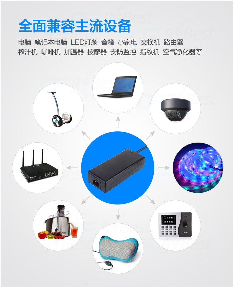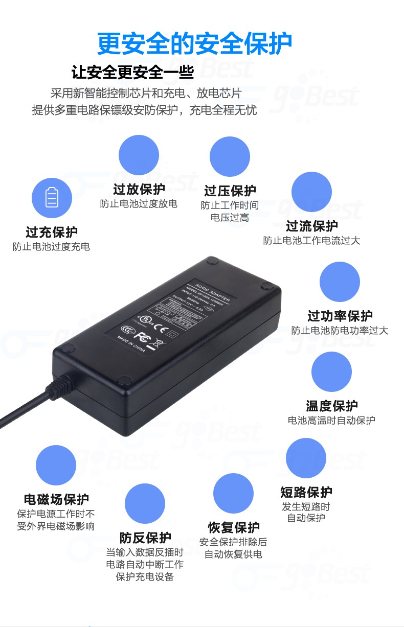 • 采用前沿IC控制方案和先进的制造工艺,高精度,低噪音;过压,过流,过充,短路等多重保护。
